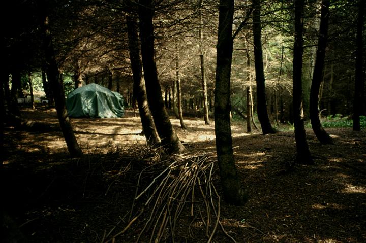 Tinkers Bubble in Somerset, early days when we lived in benders on the top of the hill. It now has more solid wooden houses made from the thinnings from their own woodland.