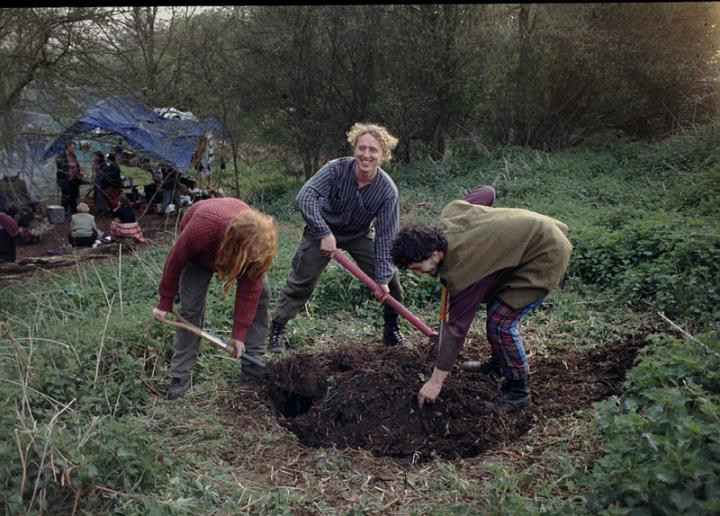 The ' Land is Ours ' was a campaign we did back in the 90's. A farmer let us use a piece of his set aside land, to demonstrate that we could have a camp and dig a vegetable patch, more symbolic really of the way we could be living. We were commemorating the 'Diggers'.