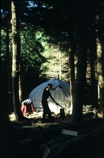 Cutting wood , a job you will have to do many times over if you choose to live in a Community whose off the national Grid, whose heating is wood burning stoves.Luckily its based in a woodland this one, Tinkers Bubble.